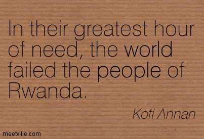 So as we look back at the atrocities of another Genocide, the United Nation’s Secretary-General Ban Ki-moon spoke at a ceremony, on April 7, 2014 held in the UNDP compound in Kigali to commemorate the UN staff members who lost their lives in the 1994 genocide in Rwanda. He also spoke of the shame of the United Nations and their inaction in helping a country when it needed the world to recognize the lives in Rwanda as are important as any life. A time when the world needed to put politics and economics aside and act on the side of humanity. In April 1994 we all were citizens of our communities and as I look back my voice was silent to the needs of one of our global communities.
